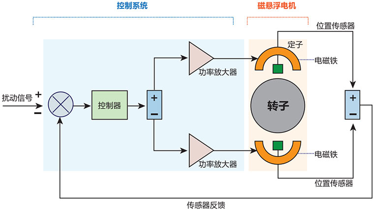 磁懸浮電機中具有多組位移傳感器,能夠實時監測轉子的徑向和軸向位置并輸出位移信號,控制器對位移信號進行解析給磁軸承線圈中通入控制電流,產生電磁力,使轉子保持懸浮狀態,此時轉子與其他部件不接觸、不存在機械摩擦。控制器向電機定子中輸入頻率可控的電流之后,產生旋轉磁場,與轉子上的永磁體激發的磁場相互作用,從而驅動轉子高速旋轉。