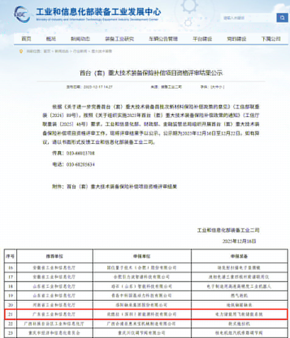 本次評選由工業和信息化部裝備工業二司組織,全國僅47家單位入選。坎德拉新能源憑借飛輪儲能系統的技術先進性與創新性,成為廣東省唯一入選企業,標志著公司在重大裝備領域獲得國家層面的權威認可與政策支持。